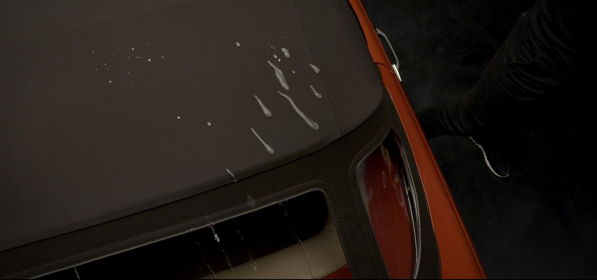 2. Shake well before use. Spray Lotos Protectant crosswise onto the fabric convertible top from a distance of approx. 30 cm and spread evenly over the entire textile surface using the enclosed foam cube.